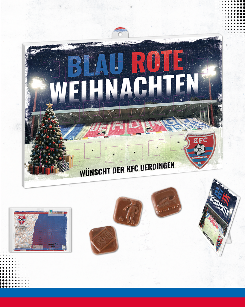 Hinter jedem Türchen wartet ein Stück feinste Schokolade in Fußballmotiven – perfekt für echte Fans. Ein Muss für alle, die Blau und Rot im Herzen tragen! ⚽️💙❤️