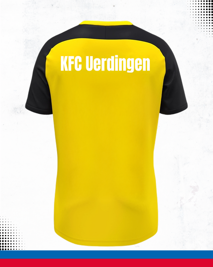 Das schwarz-gelbe Trikot wird mit Sponsoren-Aufdruck und Rückenaufdruck "KFC Uerdingen" geliefert.