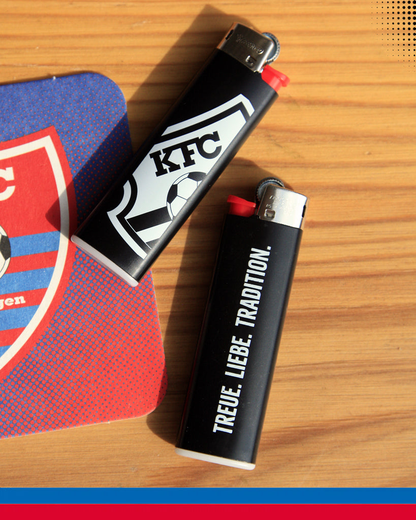 Das KFC Uerdingen Feuerzeug trägt die Worte „Treue. Liebe. Tradition.“ – Werte, die den Verein ausmachen. Im klassischen BIC-Slim-Style liegt es gut in der Hand und ist zuverlässig im Einsatz. Ein kleines Accessoire mit großer Aussagekraft, das in keiner Fan-Ausstattung fehlen sollte.